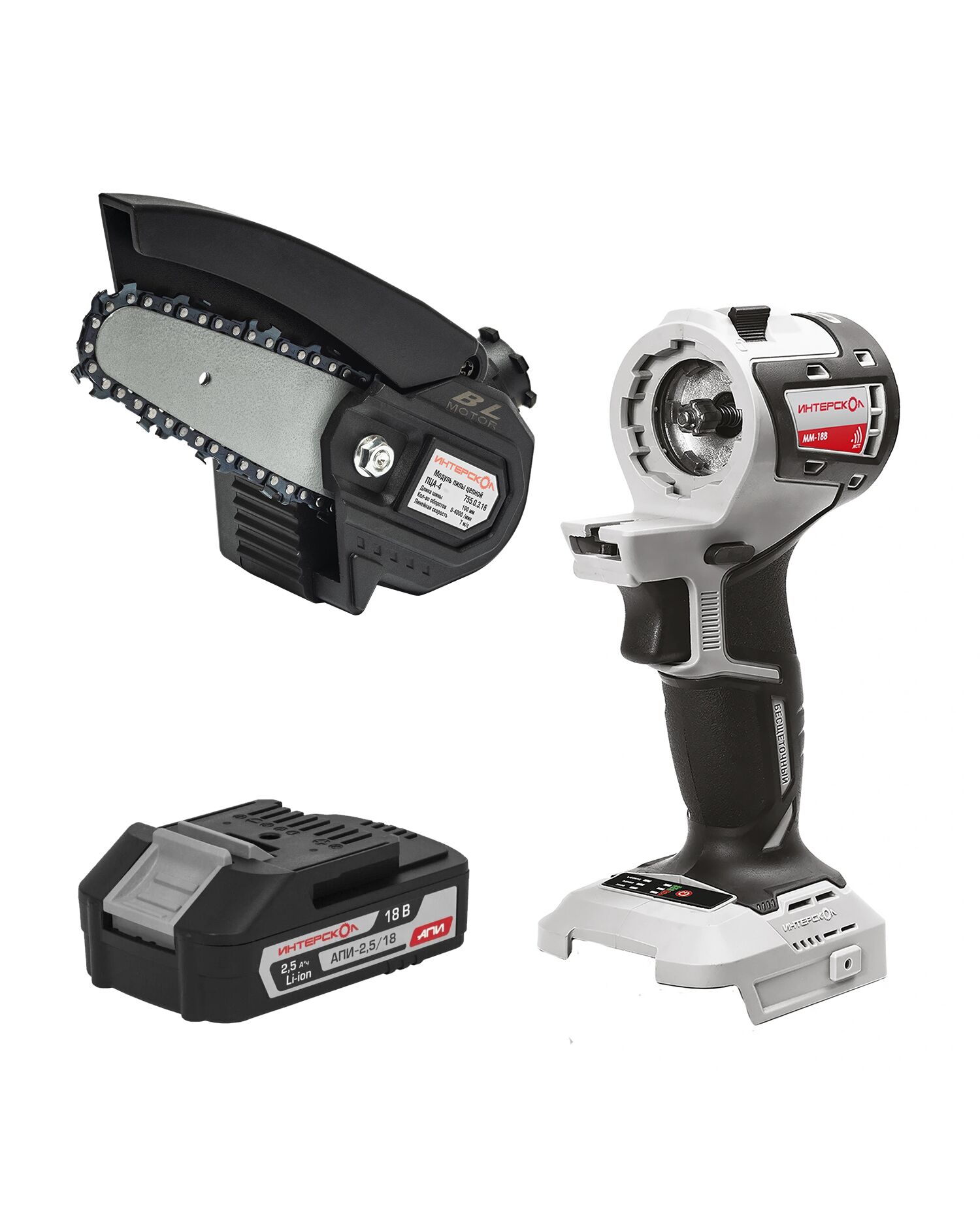 Цепная пила ИНТЕРСКОЛ ПЦА-4/18ВМ – основа для формирования необходимого инструментального набора в зависимости от специализации пользователя. При желании и необходимости его можно без каких-либо сложностей и заметных расходов дополнить дрелями-шуруповертами ДА-13/18В (безударная) или ДАУ-13/18В (ударная), перфоратором ПА-14/18В, угловой шлифовальной машиной УШМ-125/18В, сабельной пилой НПА-100/18В, лобзиком МПА-50/18В, реноватором МФИ-18В, мини-мойкой АМ-30/18В, ножницами для травы НСА-80/18В, гайковертом ГАУ-300/18В, шуруповертом ШАУ-180/18В и прочим инструментом – всего более 15-ти наименований.