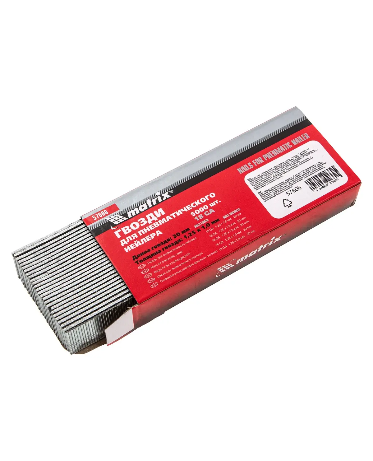 Гвозди для пневматического нейлера, Matrix 18GA 57606 — крепежные элементы длиной 20 мм, шириной 1,25 и толщиной 1 мм, предназначенные для установки в пневматические нейлеры. С их помощью можно обить мебель, установить теплицу, закрепить плинтусы и настил. Комплекта из 5000 штук хватит для выполнения большого объема работ.