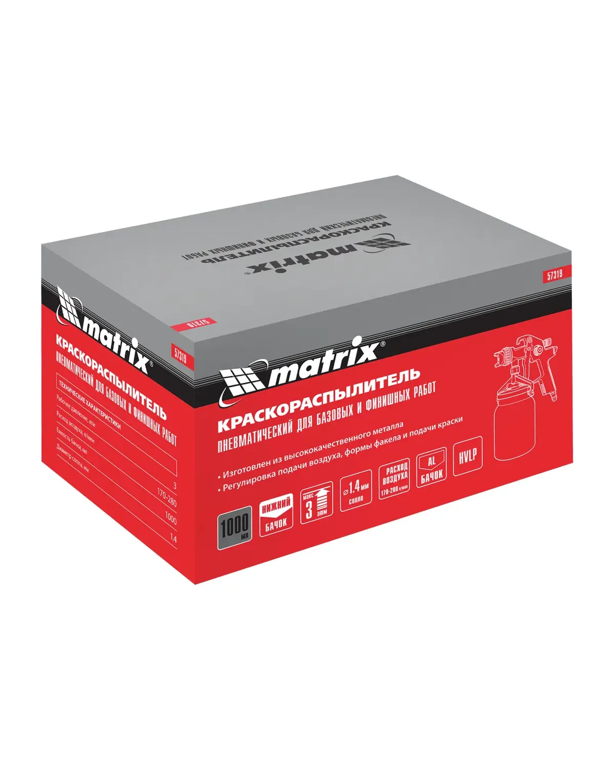 Краскораспылитель Matrix HVLP пневматический с нижним бачком V= 1 л, сопло диаметром 1.4 мм