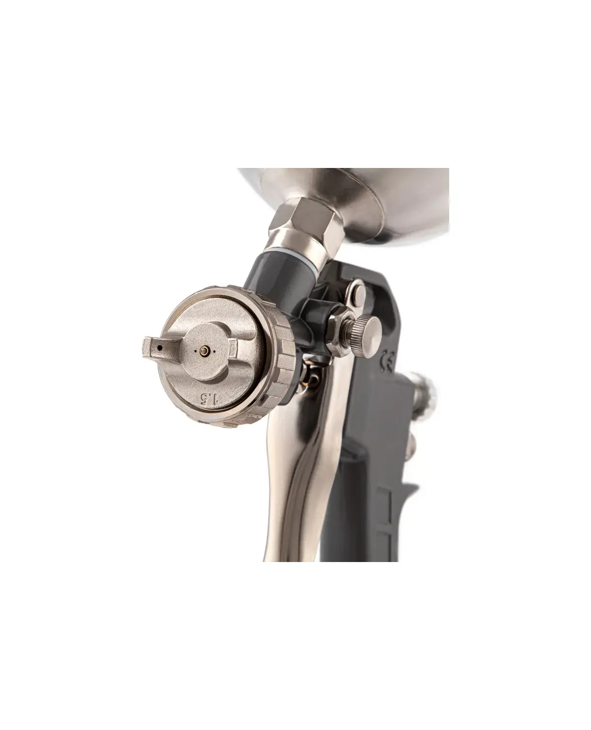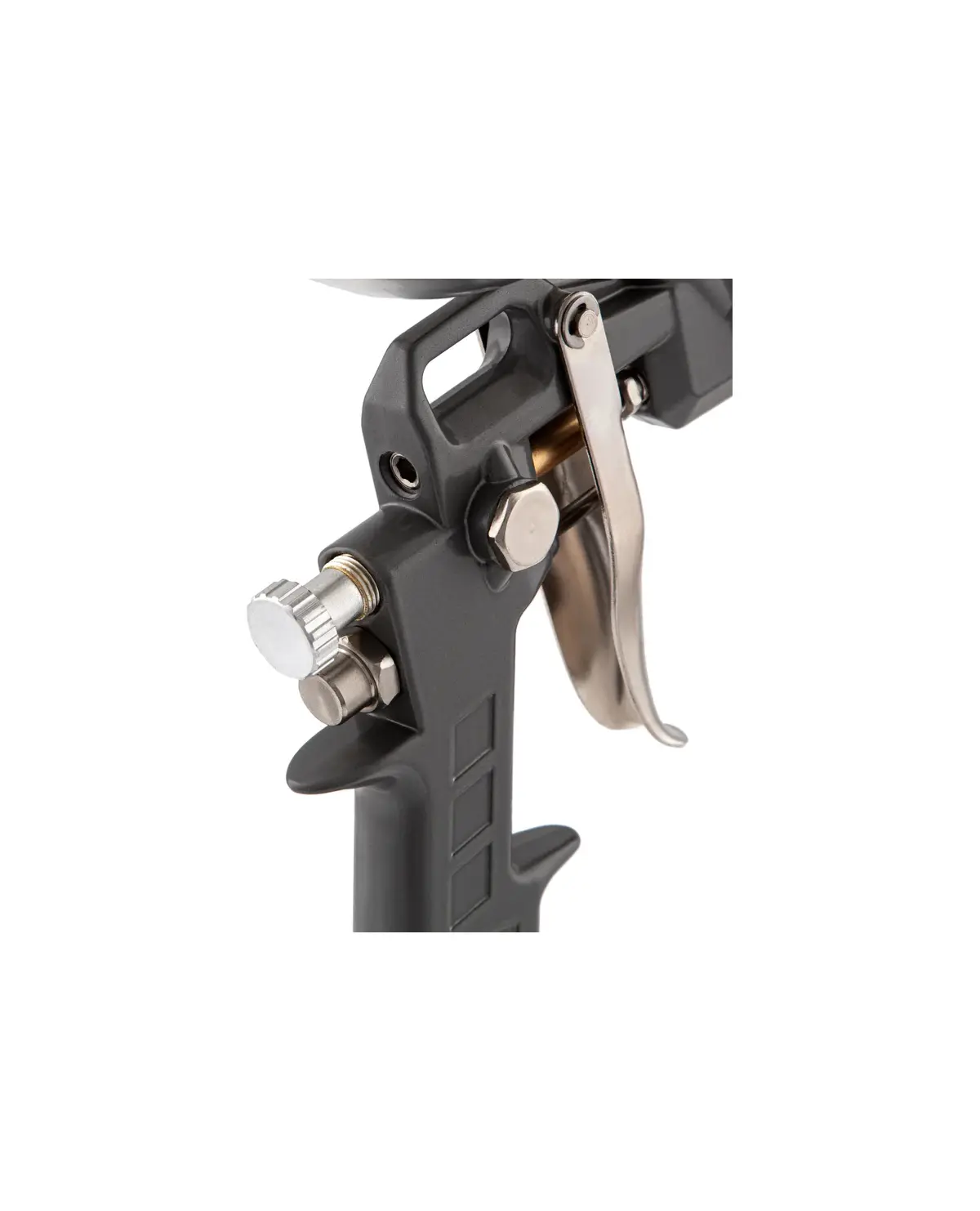 Краскораспылитель пневматический MATRIX, верхний бачок 0.6л (57314ми) позволяет наносить на поверхность защитные, декоративные и изоляционные покрытия. Он имеет верхнее расположение бачка и вмещает в себя до 0.6 литра краски. Конструкция краскопульта выполнена из металла, благодаря чему устойчива к механическим повреждениям в случае падения. В комплекте прилагаются сопла диаметром 1.2, 1.5 и 1.8 мм. Благодаря использованию технологии MIDDLE PRESSURE состав распыляется максимально равномерно. Объем бака составляет 0,6 л – не требуется частых перерывов на заправку. Система регулировки позволяет настроить форму факела и подачу материала. Рабочее давление регулируется в диапазоне от 3 до 4 бар, расход воздуха – от 75 до 230 л/мин. Это позволяет максимально точно настроить краскораспылитель MATRIX на предстоящую операцию. Алюминиевый бак устойчив к возникновению коррозии и не боится воздействия растворителей.