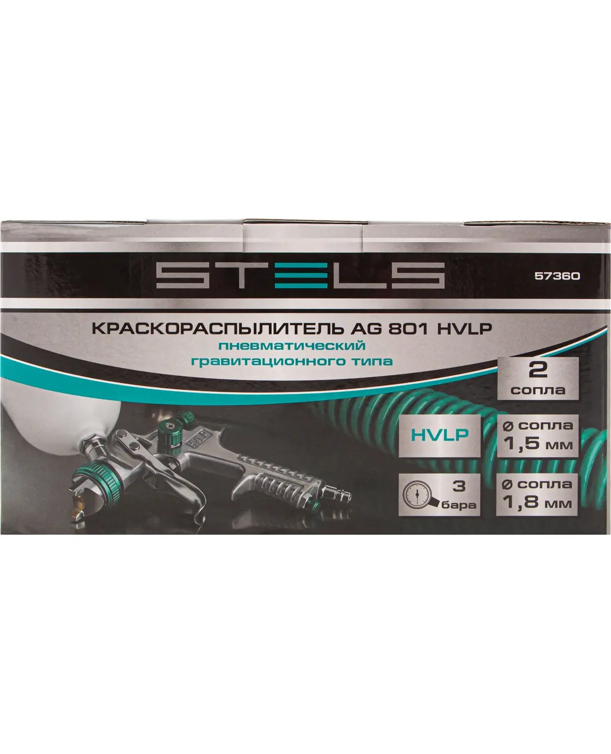 Краскораспылитель пневматический STELS AG 801 HVLP, гравитационный, сопло 1.5 мм и 1.8 мм