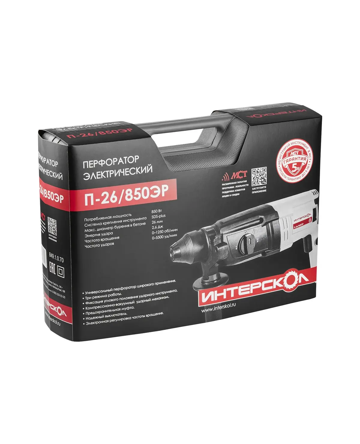 Перфоратор ИНТЕРСКОЛ П-26/850ЭР 850 Вт, 3 реж., 2.6 Дж, SDS+, 2.9 кг, кейс