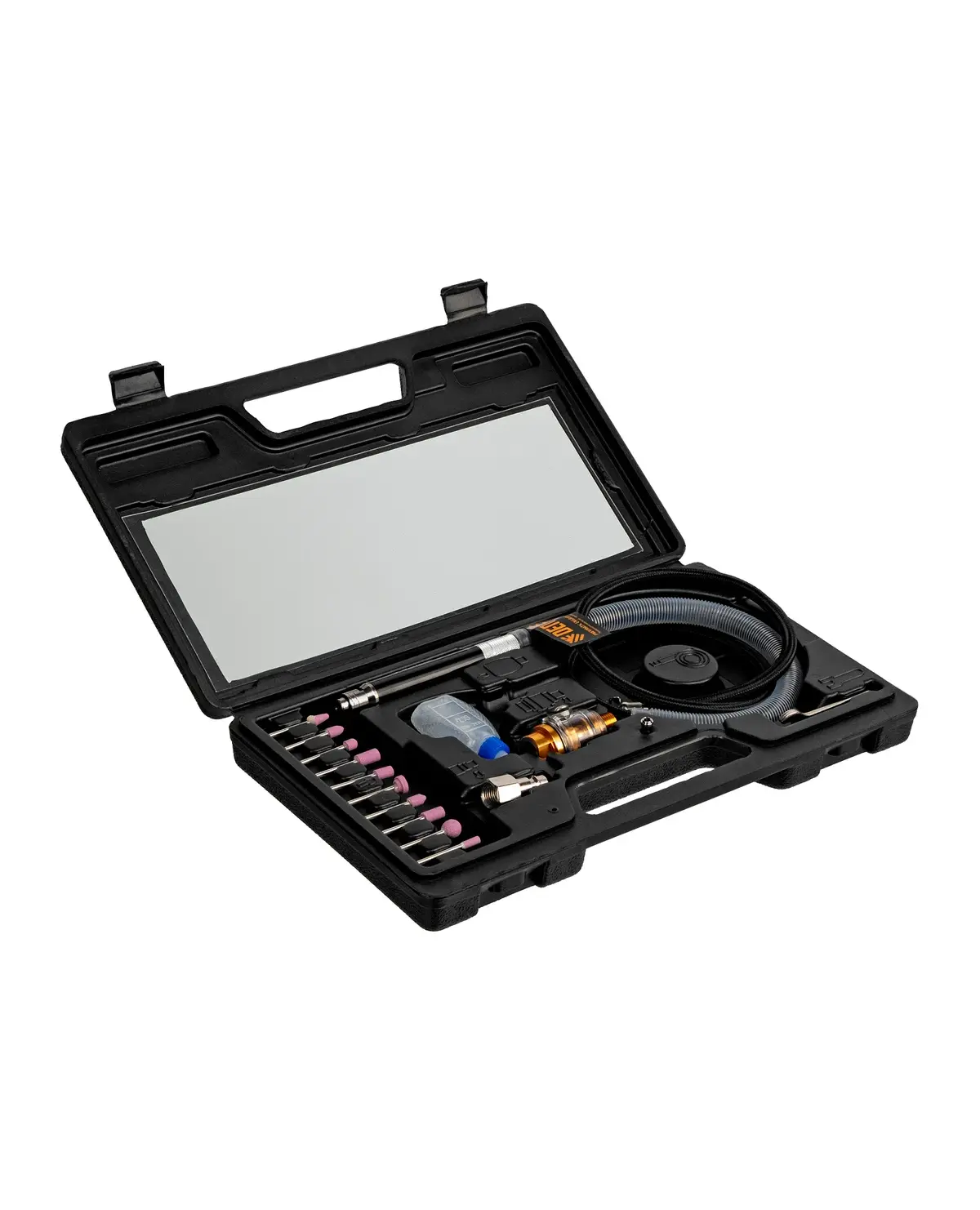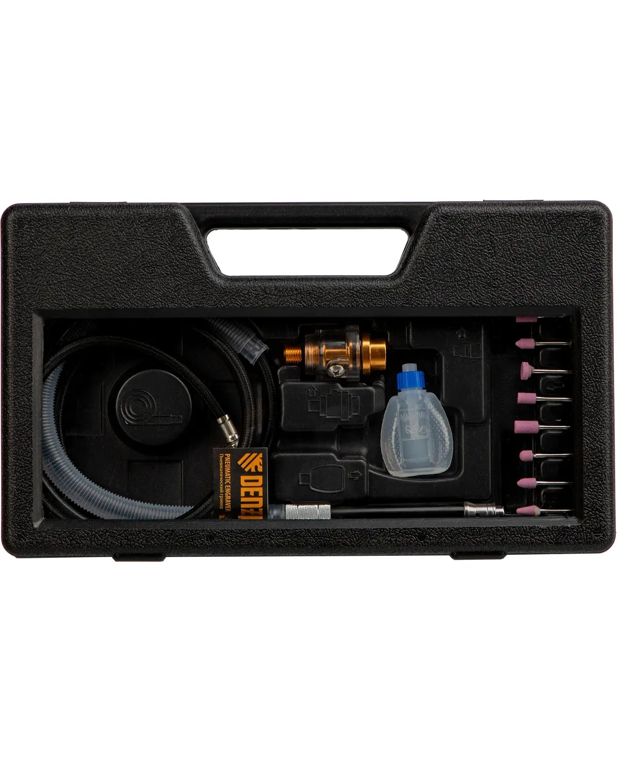 Гравер Denzel PE54000 имеет компактный корпус и весит всего 100 г – таким удобно работать даже в ограниченном пространстве. Поворотный регулятор позволяет легко настроить скорость вращения под каждый материал. Для обслуживания инструмента в комплект включены гаечные ключи и масленка. В пластиковом кейсе предусмотрены защитные элементы, чтобы обеспечить безопасность при переноске. Алюминиевый корпус обеспечивает защиту инструмента. Встроенный фильтр удерживает засоряющие частицы. Влагоотделитель предотвращает образование коррозии. Длинный шланг 110 см не сковывает движения мастера. Масленка и ключи входят в комплект поставки.