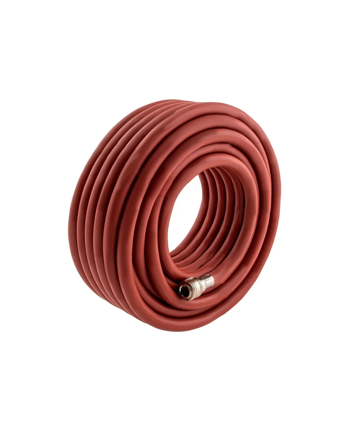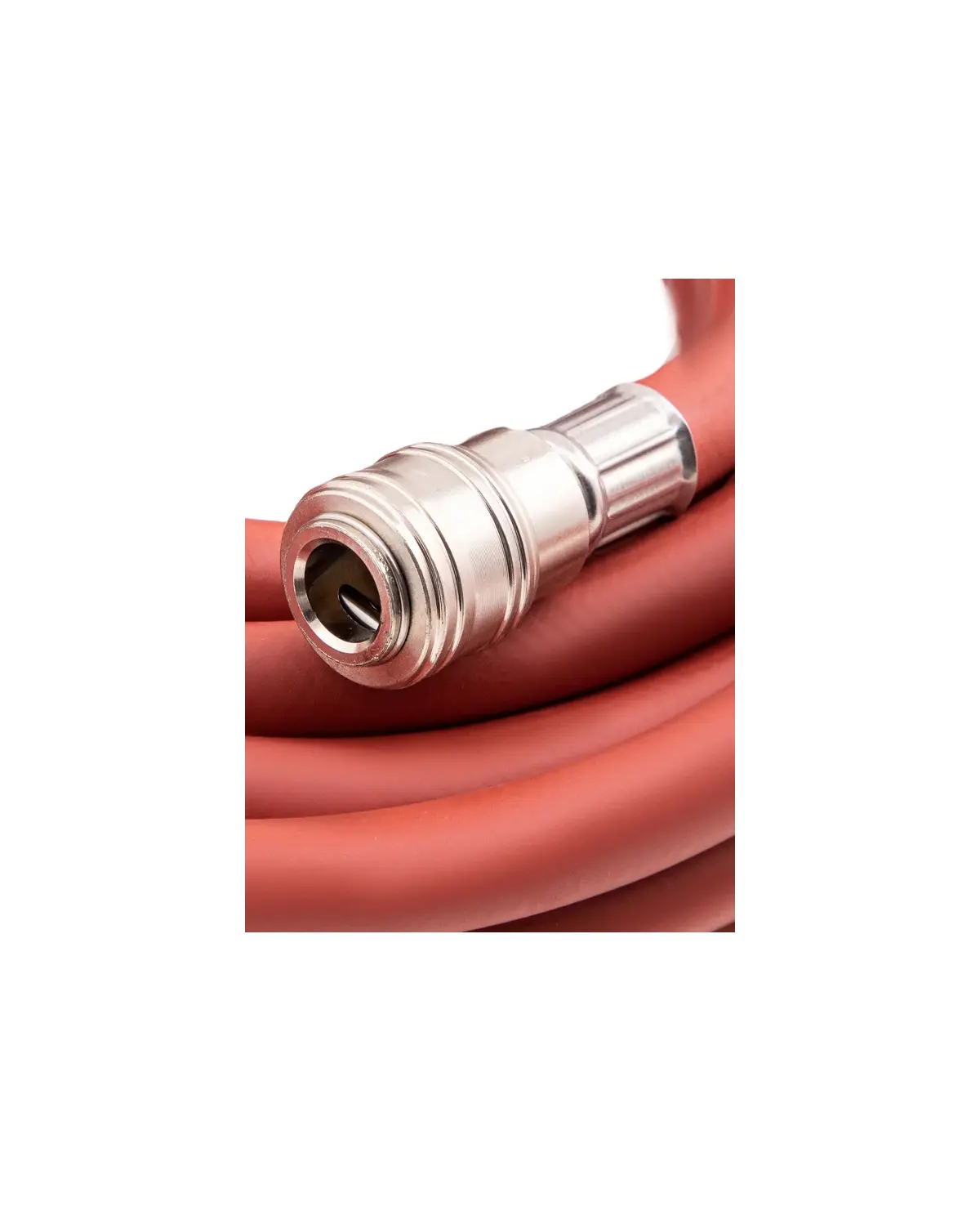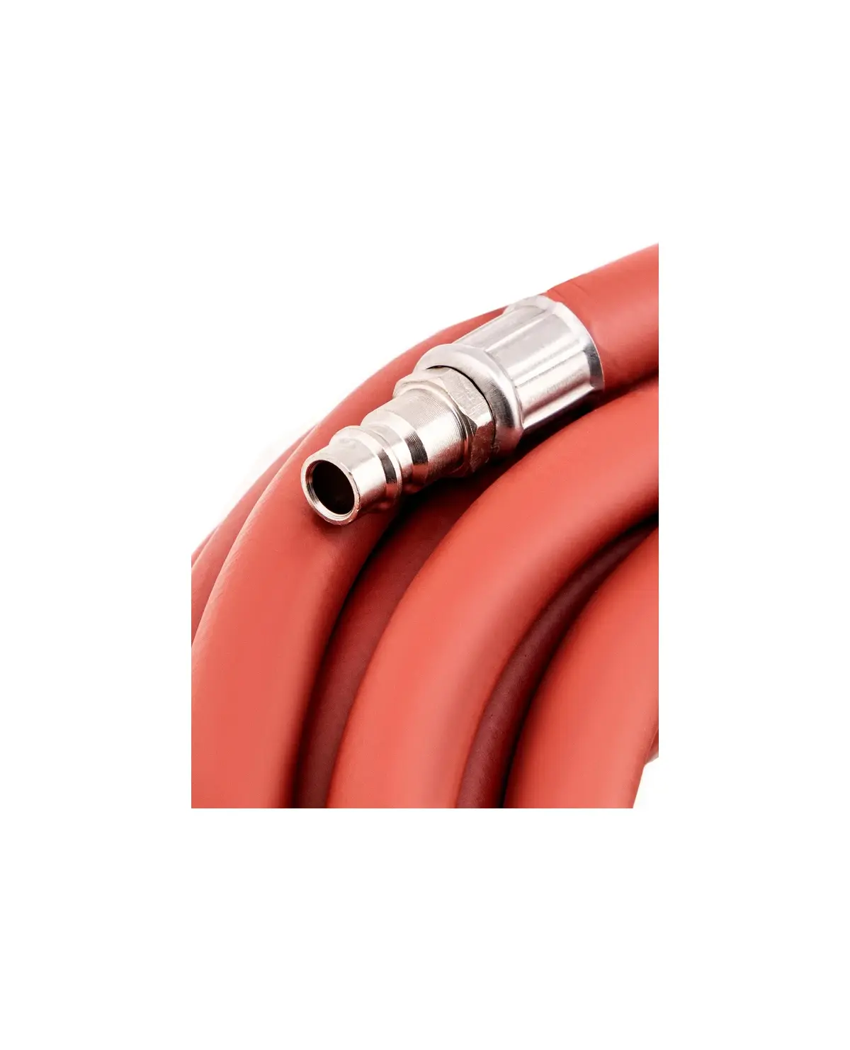 Установленные быстросъемные разъемы типа Rapid упрощают соединение с компрессором и инструментом. Никелевое покрытие штуцера и муфты обеспечивает долговечность оснастки. Шланг выдерживает давление до 24 бар и изменение температуры от -35 до 60 °C. Рукав имеет внутренний диаметр 10 мм, наружный – 16 мм и устойчив к нагрузкам.