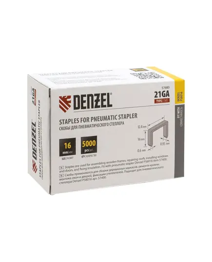 Скобы Denzel 21GA для пнев. степл., 16 мм, шир. - 0,95 мм, тол. - 0,6 мм, шир. скобы - 12,8 мм, 5000 шт