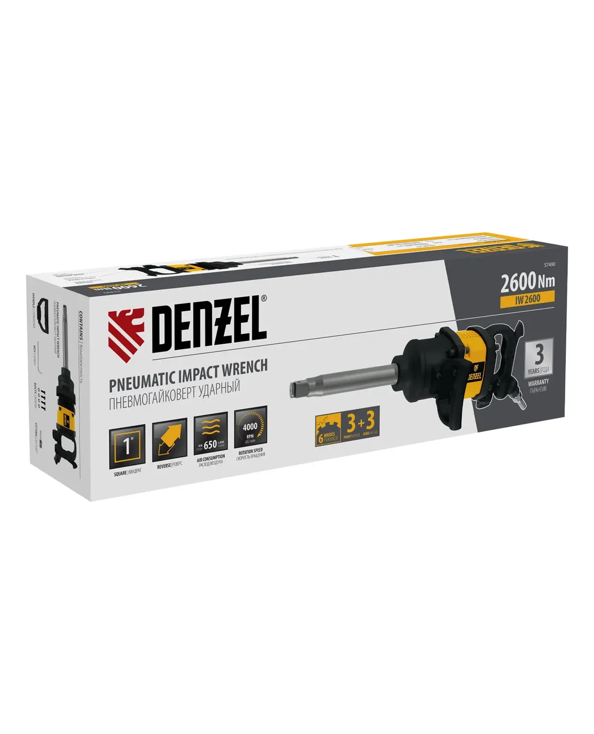 Ударный пневмогайковерт Denzel IW2600 (57490) с присоединительным квадратом 1" обеспечивает скорость вращения вала 4000 об/мин и развивает крутящий момент до 2600 Нм. Оптимально подходит для работы с крупными гайками и болтами. 6 режимов работы (3 вперед + 3 назад) дают возможность проводить различные операции с крепежом, работать с левой резьбой и точно выбирать прикладываемое усилие. Эргономичная прорезиненная рукоятка удобно ложится в руку, а также снижает уровень передаваемых вибраций.